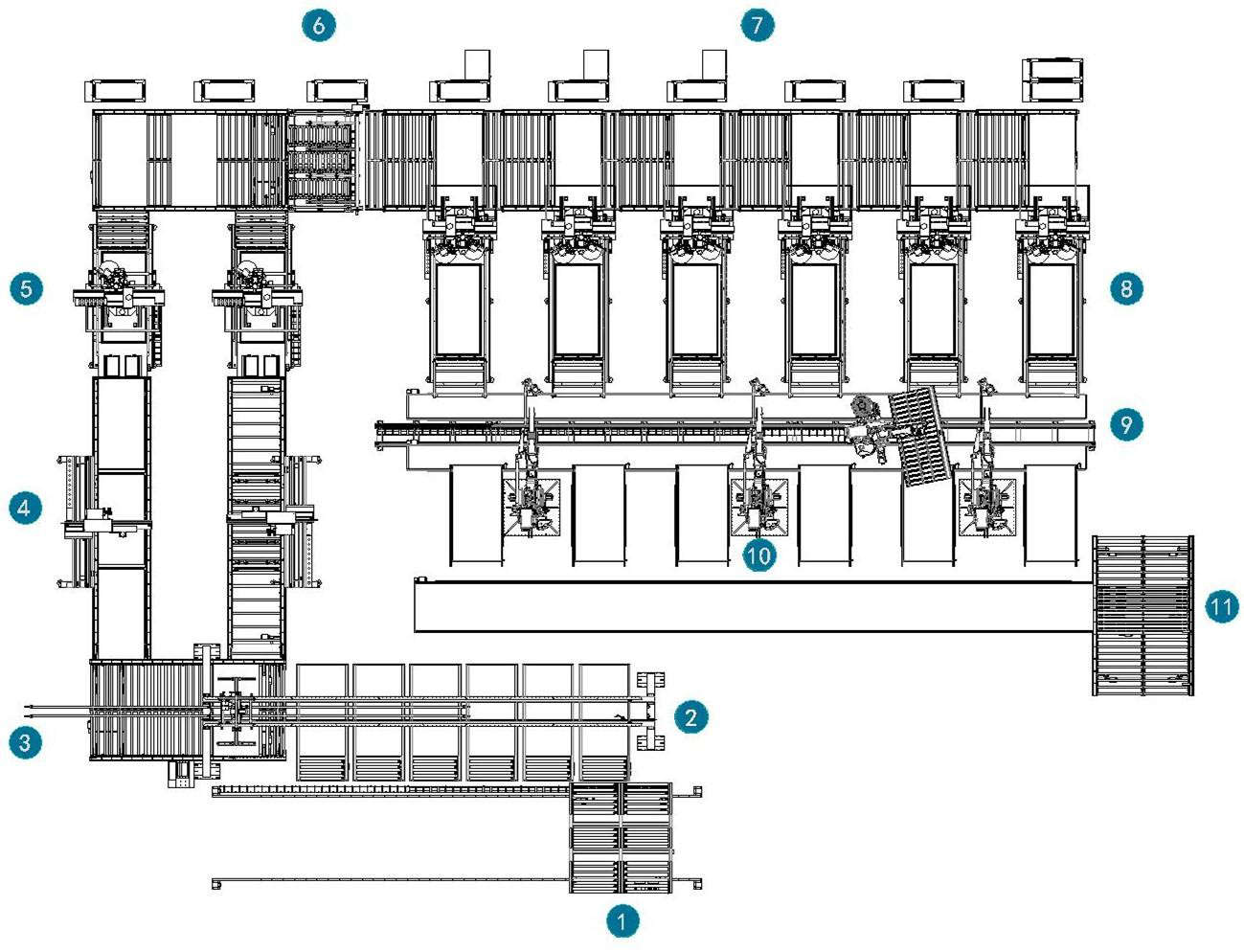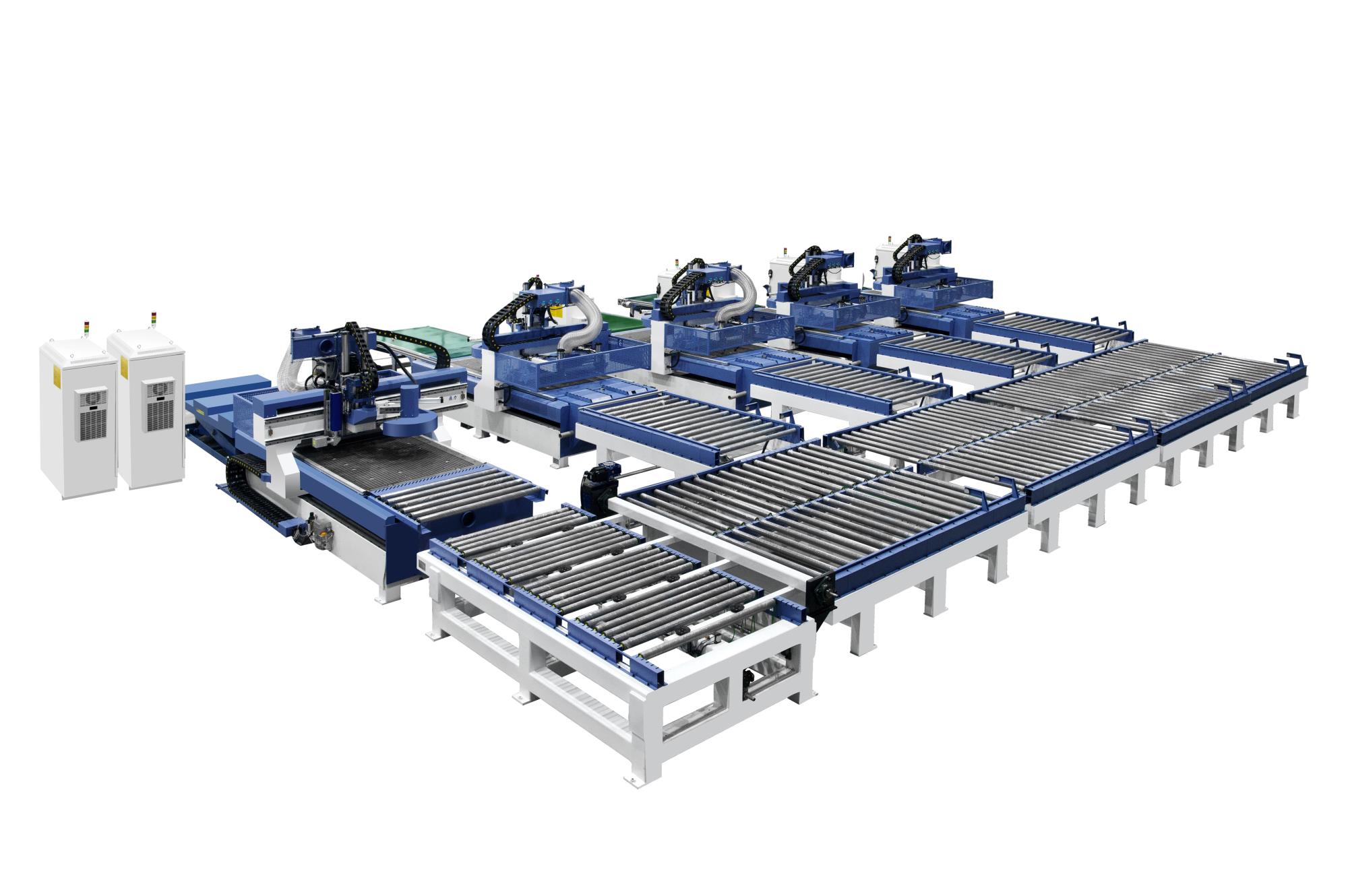 我司現(xiàn)推出一款PVC 模壓門板生產(chǎn)線,主要功能:實現(xiàn)在門板背面完成打標、打鎖孔和鉸鏈孔以及玻璃門加工,整板材料翻面、分配、輸送到正面加工機器,完成門板正面造形加工、玻璃門切斷,隨后機機器自動將材料推出到下料臺上人工分單。